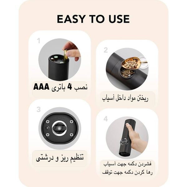 فلفل‌ساب و نمک‌ساب برقی با طراحی ساده، موتور قدرتمند و قابلیت تنظیم آسیاب، تجربه‌ای تازه و خوش‌طعم از ادویه‌پاشی را به آشپزی شما می‌آورد. این محصول کوچک اما کاربردی، کمک می‌کند هر وعده غذایی با عطر و طعم واقعی ادویه‌ها آماده شود 🌿🍽️